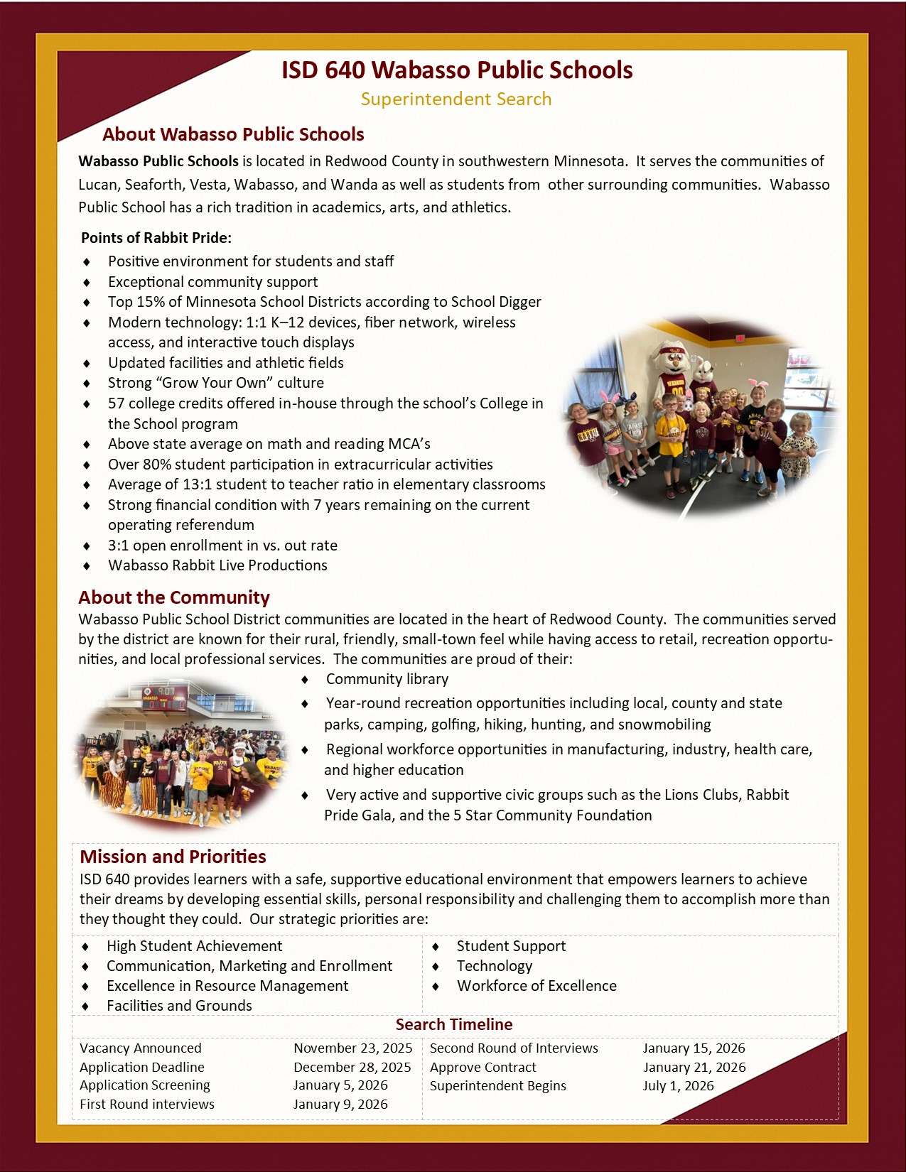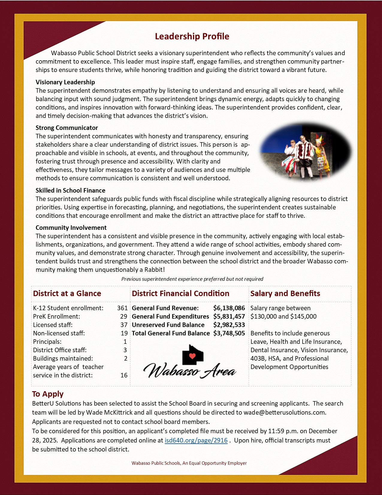 Wabasso Public School District seeks a visionary superintendent who reflects the community’s values and commitment to excellence. This leader must inspire staff, engage families, and strengthen community partnerships to ensure students thrive, while honoring tradition and guiding the district toward a vibrant future. BetterU Solutions has been selected to assist the School Board in securing and screening applicants. The search team will be led by Wade McKittrick and all questions should be directed to . Search Timeline: Vacancy Announced November 23, 2025 Application Deadline December 28, 2025 Application Screening December 29, 2025-January 5, 2026 First Round Interviews January 9, 2026 Second Round Interviews January 15, 2026 Superintendent Begins July 1, 2026 To apply CLICK HERE ![]()